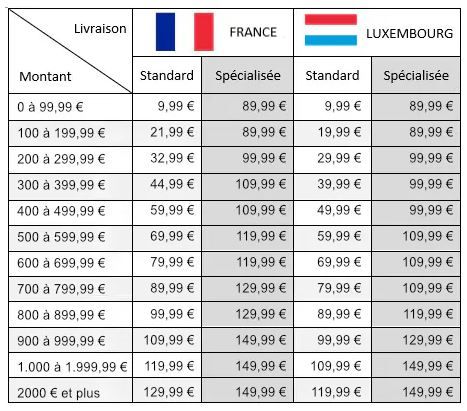 Le montant des frais de livraison est calculé en fonction du montant total de votre panier. Voici un tableau récapitulatif :